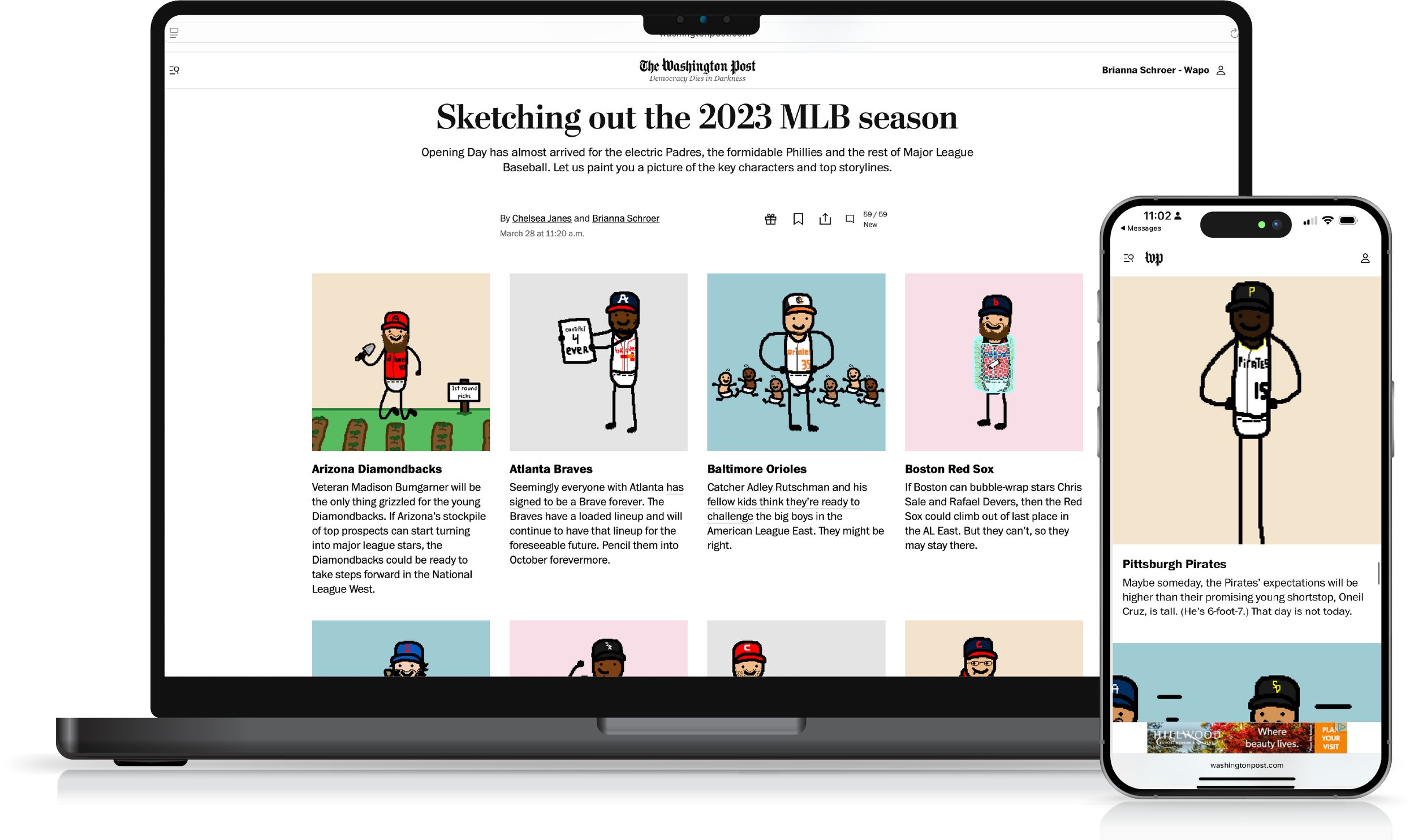 The anonymous “NBA Paint” Twitter account was getting a lot of buzz online with his live NBA drawings during games. I knew it was a long shot, but reached out to him to see if he would be interested in a baseball project ahead of the 2023 season. To my surprise, he was! Once we got buy-in, I worked with MLB reporter Chelsea Janes and came up with “storylines” for all 32 MLB teams and let “NBA Paint” run wild with his drawings. This project was a fun way to tell a story we have done every year and got a lot of attention on social media.