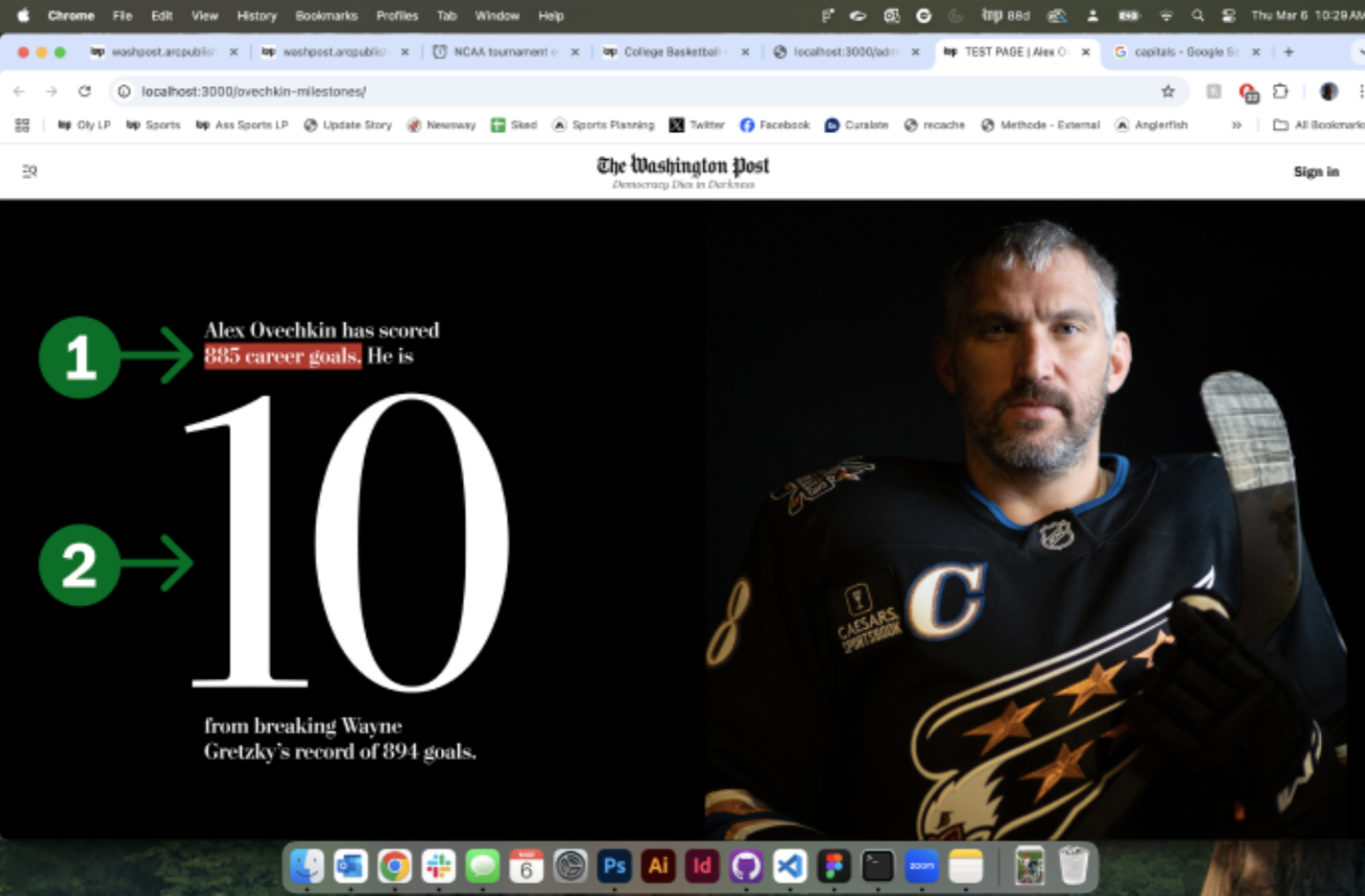 I collaborated with editors and teams across the newsroom to ensure alignment around our record-breaking coverage. I predesigned poster pages, multiple A1 print options for any night the record could be broken, Instagram graphics for goals 20–1 and the record-breaking moment, and supporting homepage assets. In addition, I helped design and promote the “Ovechkin Career” commemorative book, which was made available for subscribers to purchase the night the record was broken.